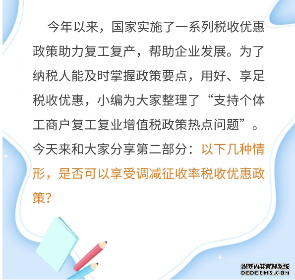 答:《財(cái)政部 稅務(wù)總局關(guān)于支持個(gè)體工商戶復(fù)工復(fù)業(yè)增值稅政策的公告》(2020年第13號(hào),以下稱13號(hào)公告)規(guī)定,自2020年3月1日至2020年5月31日,湖北省增值稅小規(guī)模納稅人,適用3%征收率的應(yīng)稅銷售收入,免征增值稅;適用3%預(yù)征率的預(yù)繳增值稅項(xiàng)目,暫停預(yù)繳增值稅。除湖北省外,其他省、自治區(qū)、直轄市的增值稅小規(guī)模納稅人,適用3%征收率的應(yīng)稅銷售收入,減按1%征收率征收增值稅;適用3%預(yù)征率的預(yù)繳增值稅項(xiàng)目,減按1%預(yù)征率預(yù)繳增值稅。根據(jù)《財(cái)政部 稅務(wù)總局關(guān)于延長(zhǎng)小規(guī)模納稅人減免增值稅政策執(zhí)行期限的公告》(財(cái)政部 稅務(wù)總局公告2020年第24號(hào))規(guī)定,《財(cái)政部 稅務(wù)總局關(guān)于支持個(gè)體工商戶復(fù)工復(fù)業(yè)增值稅政策的公告》(財(cái)政部 稅務(wù)總局公告2020年第13號(hào))規(guī)定的稅收優(yōu)惠政策實(shí)施期限延長(zhǎng)到2020年12月31日。